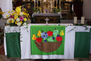 Erntegaben, also das, was zum Leben wichtig ist, zur Kirche