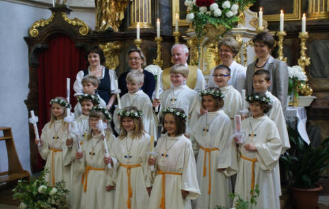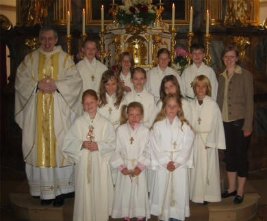 7 Mädchen und 5 Buben empfingen am Dreifaltigkeitssonntag zum ersten Mal das Sakrament der Eucharistie. Unter großer Anteilnahme der Pfarrbevölkerung und unter Mitwirkung des Jugendchores feierten die Kinder mit Pfarrer Josef Gugler den Gottesdienst. Es war ein großartiges Fest.