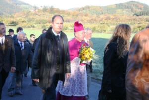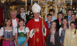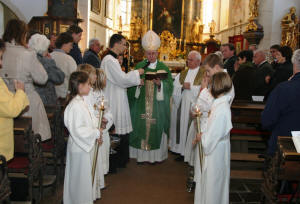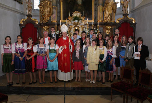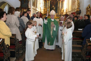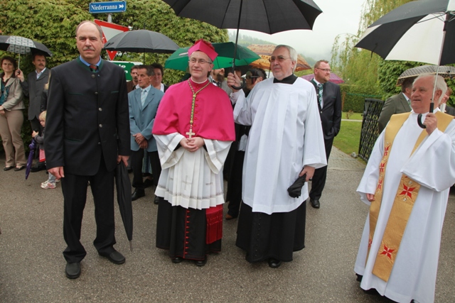 Bischof DDr. Klaus Küng wurde von Kindern der Volksschule, Pfarrer Josef Gugler und BGM Manfred Hackl beim Johannesbildstock herzlich willkommen geheißen. Unter musikalischer Begleitung durch den Musikverein Mühldorf zogen die Ehrengäste und viele Pfarrangehörige mit dem hohen Gast zur Kirche.
